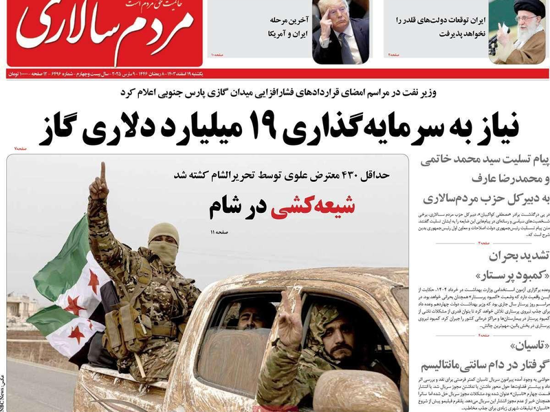وعنونت صحيفة "مردم سالاري" الإصلاحية أيضًا حول أحداث سوريا وكتبت: "إبادة الشيعة في الشام"، وقالت إن 430 متظاهرًا تم قتلهم على يد قوات هيئة تحرير الشام.