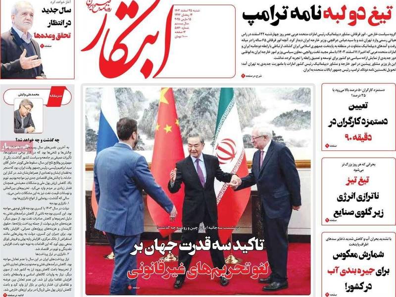 لا يزال مصير رسالة ترامب إلى إيران يشكل محورًا رئيسيا في تغطية الصحف الإيرانية اليومية؛ حيث تكاد تجمع الصحف الصادرة اليوم السبت 15 مارس (آذار)، على النظرة المتشائمة تجاه هذه الرسالة ومآلاتها.