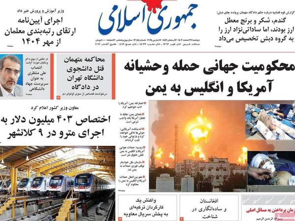 صحف أصولية مثل "كيهان" و"جوان" دعت الحوثيين إلى التصعيد وعدم المبالاة بالتهديدات الأميركية، مؤكدة أن الهجمات الأميركية لا ينبغي أن توقف "اليمنيين" عن مساندة أهل غزة.