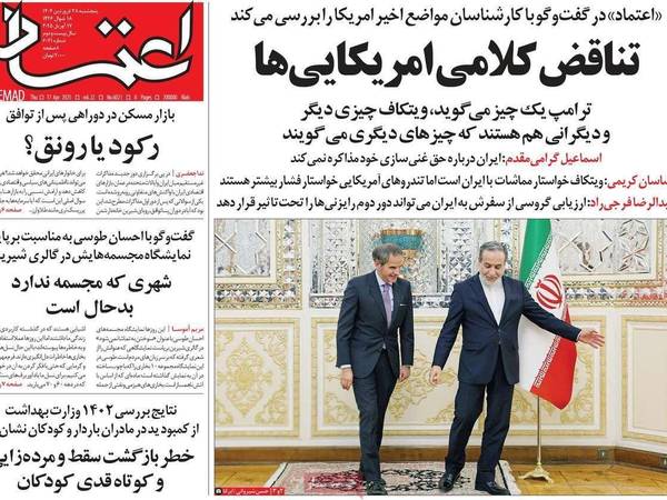 الصحيفة نقلت تصريحات فؤاد إيزدي، الخبير في الشؤون الأميركية، والتي قال فيها إنه لا ينبغي أن يتفاءل الإيرانيون كثيرا بزيارة غروسي وبالمفاوضات عموما، معتقدا أن زيارة غروسي إلى طهران تمت بتنسيق مع الولايات المتحدة الأميركية.