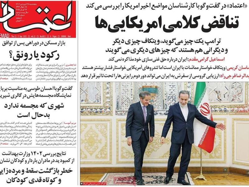 الصحف الإيرانية الصادرة اليوم الخميس 17 أبريل (نيسان) أشارت إلى تصريحات المسؤولين الأميركيين المتعارضة مع المواقف الرسمية للجانب الأميركي في طاولة المفاوضات، وأكدت أنه وبينما تؤكد طهران على أن المفاوضات محصورة في الملف النووي يلوح الطرف الأميركي بأن المفاوضات والاتفاق المحتمل لابد وأن يشمل أبعادا أخرى تتعلق بالقدرات الصاروخية لإيران، ودورها الإقليمي والعسكري في المنطقة.