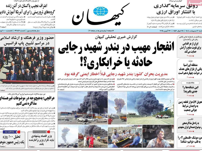سيطر الانفجار المهيب، الذي هزّ محافظة بندر عباس، الواقعة جنوب إيران، ودمر جزءًا كبيرًا من مينائها الاستراتيجي، على عناوين الصحف الإيرانية الصادرة يوم الأحد 27 أبريل (نيسان)، وهمّش جزئيًا أخبار الجولة الثالثة من المفاوضات بين إيران وأميركا، التي عُقدت أمس في عُمان.