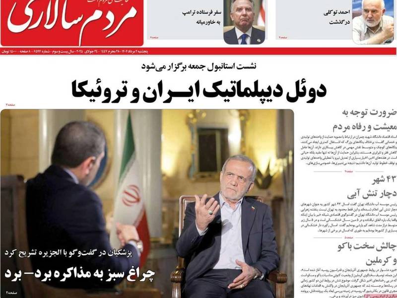 اهتمت الصحف الإيرانية، الصادرة اليوم الخميس 24 يوليو (تموز)، بتصريحات الرئيس الإيراني مسعود بزشكيان ووزير الخارجية الأسبق منوشهر متقي عن استعداد إيران للانسحاب من اتفاقية حظر انتشار السلاح النووي، بالإضافة إلى الأزمات الاقتصادية، وشح المياه.