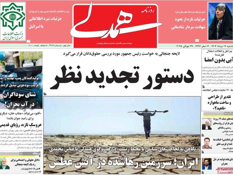 اهتمت الصحف الإيرانية الصادرة اليوم الثلاثاء 29 يوليو (تموز) بالحديث عن "إنجازات" جهاز الاستخبارات، واستمرار الجدال حول مشروع "مكافحة نشر المحتوى الإخباري" بالتوازي مع تسليط الضوء على الأزمات المعيشية، وانهيار سوق المال، وأزمة المياه التي تهدد ملايين المواطنين.