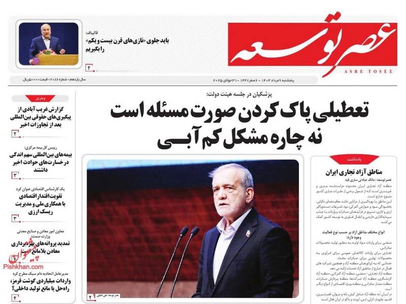 وعارض الرئيس مسعود بزشكيان في اجتماع مجلس الوزراء مقترح منح الإيرانيين عطلة أسبوع، وقال: "يجب أن نسعى لإدارة استهلاك الموارد لتجاوز الأزمة؛ فالعطلة مجرد تجميل للمشكلة وليس حلاً لأزمة نقص المياه".