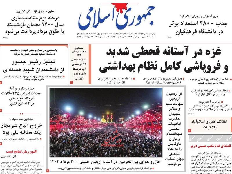 هيمنت القضايا السياسية والاقتصادية على تغطيات الصحف الإيرانية الصادرة اليوم الأربعاء 13 أغسطس (آب)، تزامنًا مع ذكرى أربعين الإمام الحسين، وتواصل الحديث عن الاستعداد لمفاوضات نووية مشروطة، وتزايد المخاوف بشأن موقع إيران الجيو-استراتيجي في ظل تطورات ممر زنغزور.