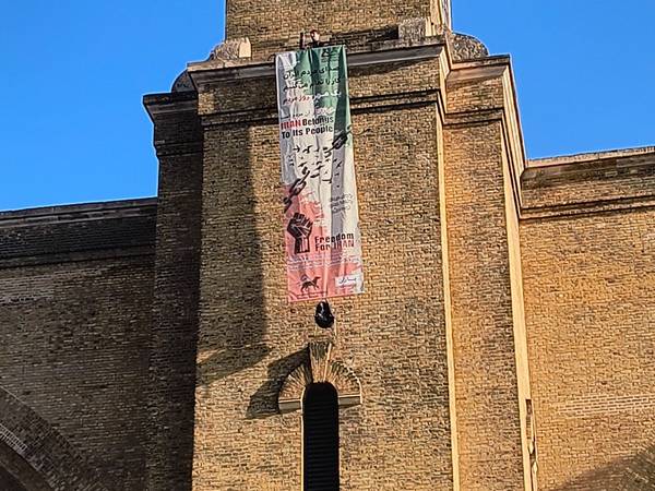 أظهر مقطع فيديو متظاهرًا يحمل كلبًا صغيرًا يقف أعلى برج الساعة في محطة "كينغز كروس" بلندن، بعد أن نشر علمًا يحمل شعارات مناهضة للنظام الإيراني.