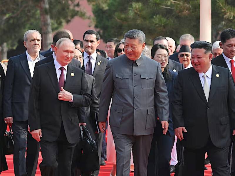 وحذّر شي من أن الإنسانية تواجه خيارًا بين "السلام أو الحرب، والحوار أو المواجهة" بينما كان يشرف على عروض لصواريخ فرط صوتية، ومسيرات تحت الماء ومقاتلات. وشمل العرض عشرات الآلاف من الجنود في مشهد وصفته الصين بأنه رمز للتضامن العالمي مع العالم النامي.