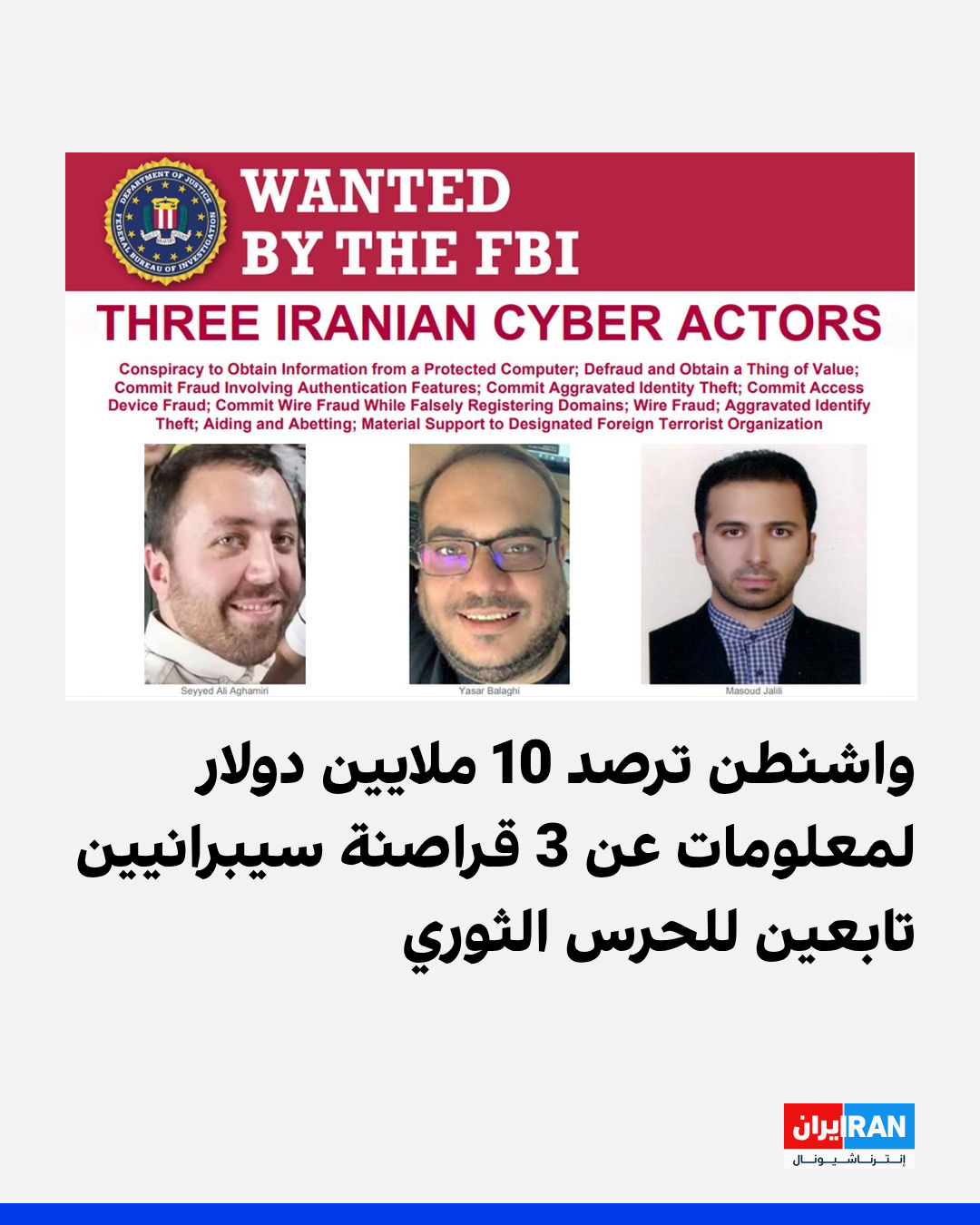 وأفاد مكتب التحقيقات الفيدرالي (FBI) أن هؤلاء المطلوبين متورطون في أنشطة إلكترونية خبيثة لصالح الحرس الثوري، مشيراً إلى أن محكمة في واشنطن العاصمة وجّهت إليهم في سبتمبر الماضي عدة اتهامات جنائية مرتبطة بالجرائم السيبرانية وأصدرت بحقهم مذكرات توقيف.