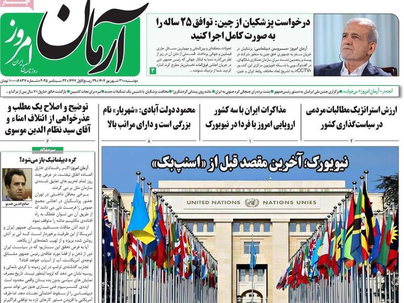 وعلى الصعيد الدبلوماسي، تتجه الأنظار نحو نيويورك؛ حيث يشارك الرئيس الإيراني في الاجتماعات السنوية للأمم المتحدة، لوسط آمال إجراء مشاورات ومفاوضات سياسية على أعلى مستوى مع قادة الدول الغربية، وكتب محلل الشأن الدولي، علي رضا سلطاني بصحيفة "شرق" الإصلاحية، أن "إيران تمر بمنعطف دبلوماسي حاسم؛ حيث تواجه خطر عودة عقوبات الأمم المتحدة. يعتمد تجنب هذا السيناريو على نجاح المفاوضات في نيويورك وبناء الثقة المتبادلة مع الغرب، بدعم من الصين وروسيا والوكالة الدولية للطاقة الذرية".