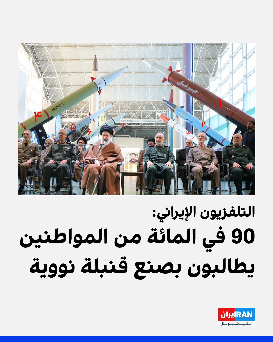 في مقابلة بين مذيع بالتلفزيون الرسمي الإيراني "صدا وسيما" والخبير في الشؤون الاستراتيجية، مصطفى خوش جشم، ذُكر أن "ما يقرُب من 90 في المائة من الإيرانيين يطالبون بصنع قنبلة نووية"، وفقًا لاستطلاعات الرأي، وذلك بعد الحرب التي استمرت 12 يومًا مع إسرائيل.