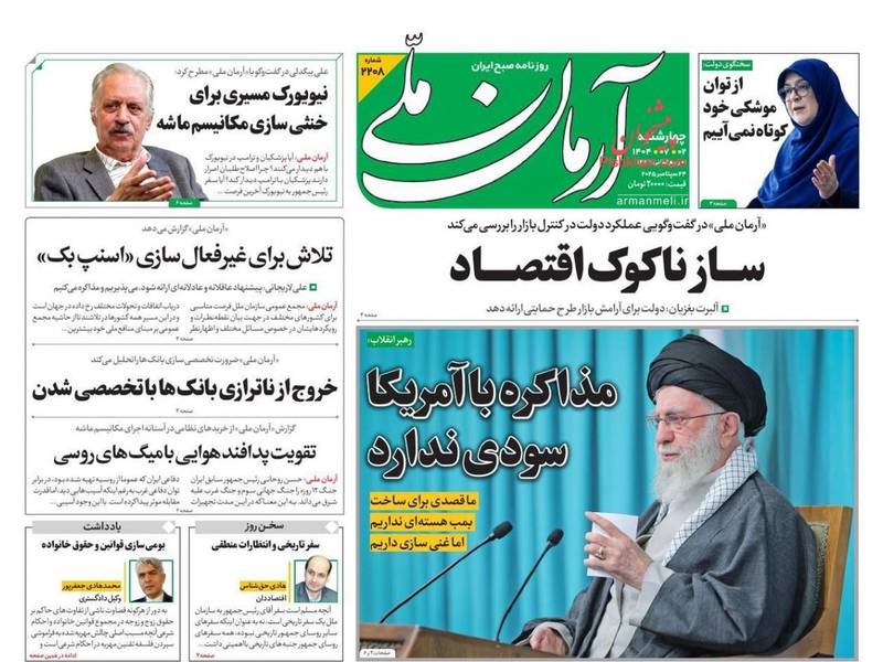 وتداولت الصحف الإيرانية تصريحات متفرقة ورسائل مصوّرة للمرشد على خامنئي، أكد خلالها عدم سعى طهران لامتلاك سلاح نووي، وأن التفاوض مع الحكومة الأميركية في الظروف الراهنة لا يحقق أي فائدة، ولن يقي إيران من أي ضرر، ويعني قبول الإملاءات الأميركية.