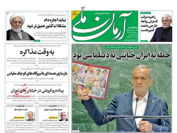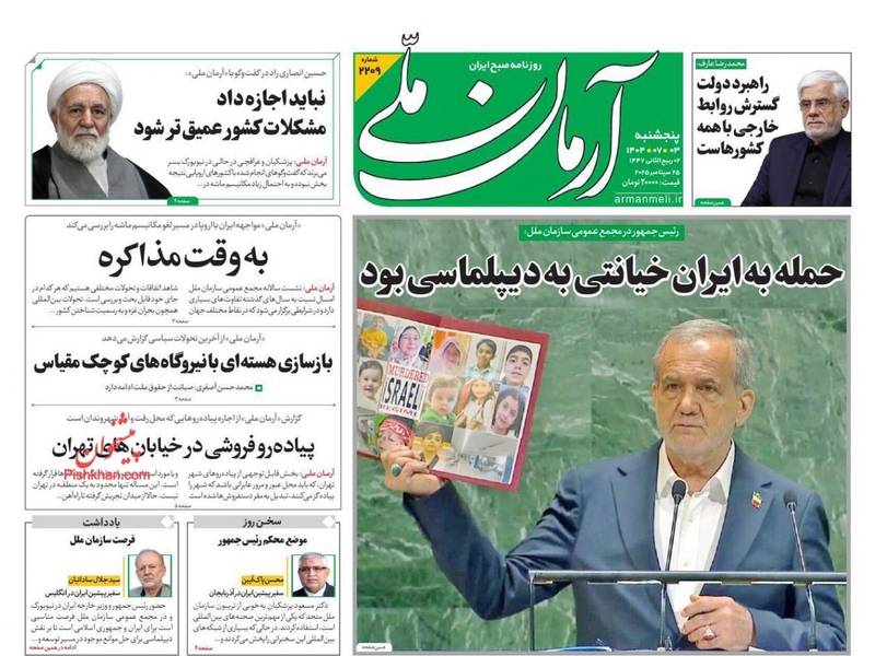 وتداولت الصحف الإيرانية على اختلاف توجهاتها السياسية، مقتطفات من كلمة الرئيس الإيراني مسعود بزشكیان أمام الجمعية العامة للأمم المتحدة، حيث شدد على تماسك إيران رغم العقوبات القاسية والحصار الطويل، واتهم واشنطن وتل أبيب بتقويض الاستقرار الإقليمي، مؤكدًا عدم سعى بلاده لامتلاك سلاح نووي.