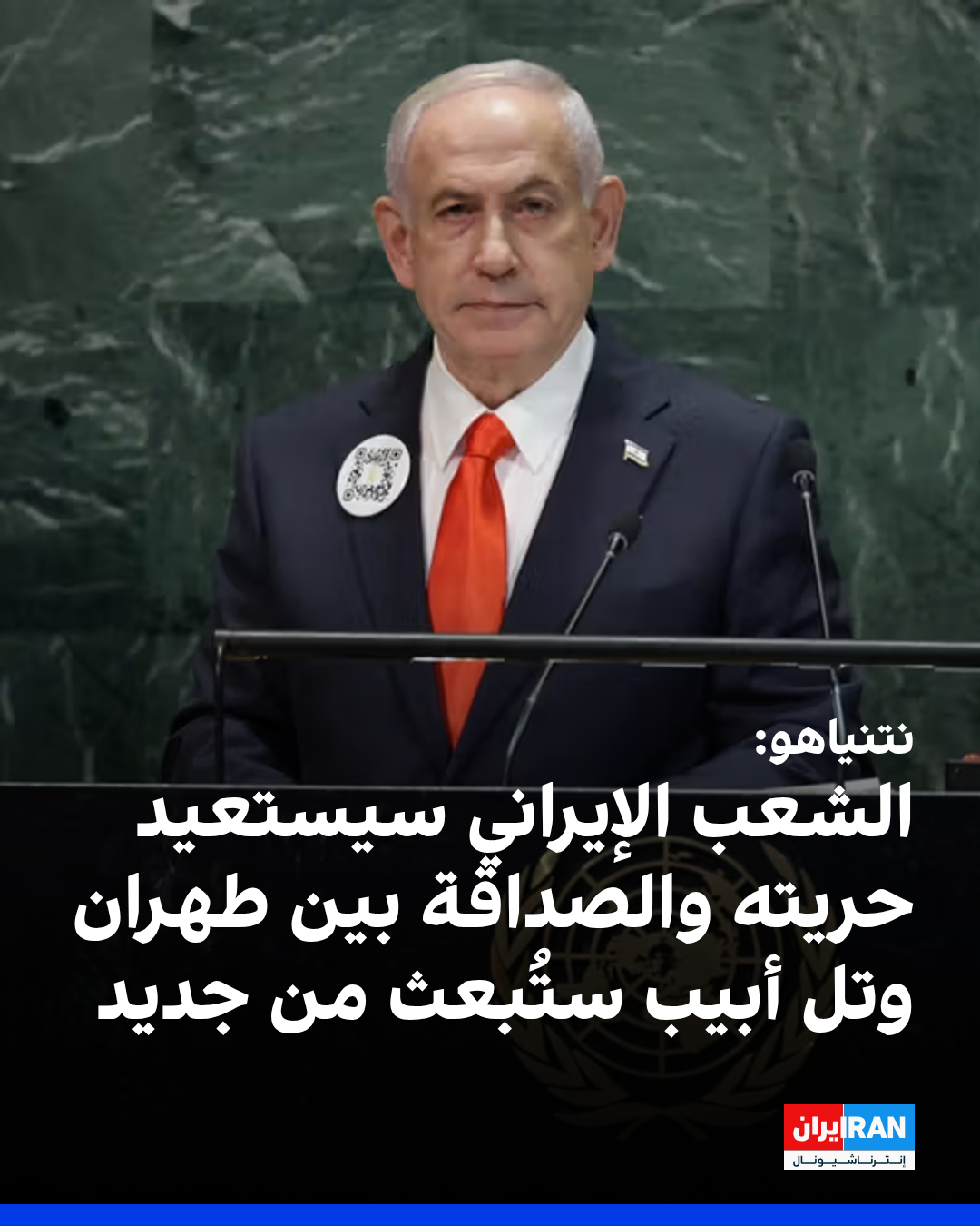 أعرب رئيس الوزراء الإسرائيلي بنيامين نتنياهو، في كلمته أمام الجمعية العامة للأمم المتحدة، عن أمله في أن يستعيد الشعب الإيراني حريته بعد سنوات من المعاناة، وأن تُستعاد الروابط التاريخية بين الشعبين الإيراني والإسرائيلي.