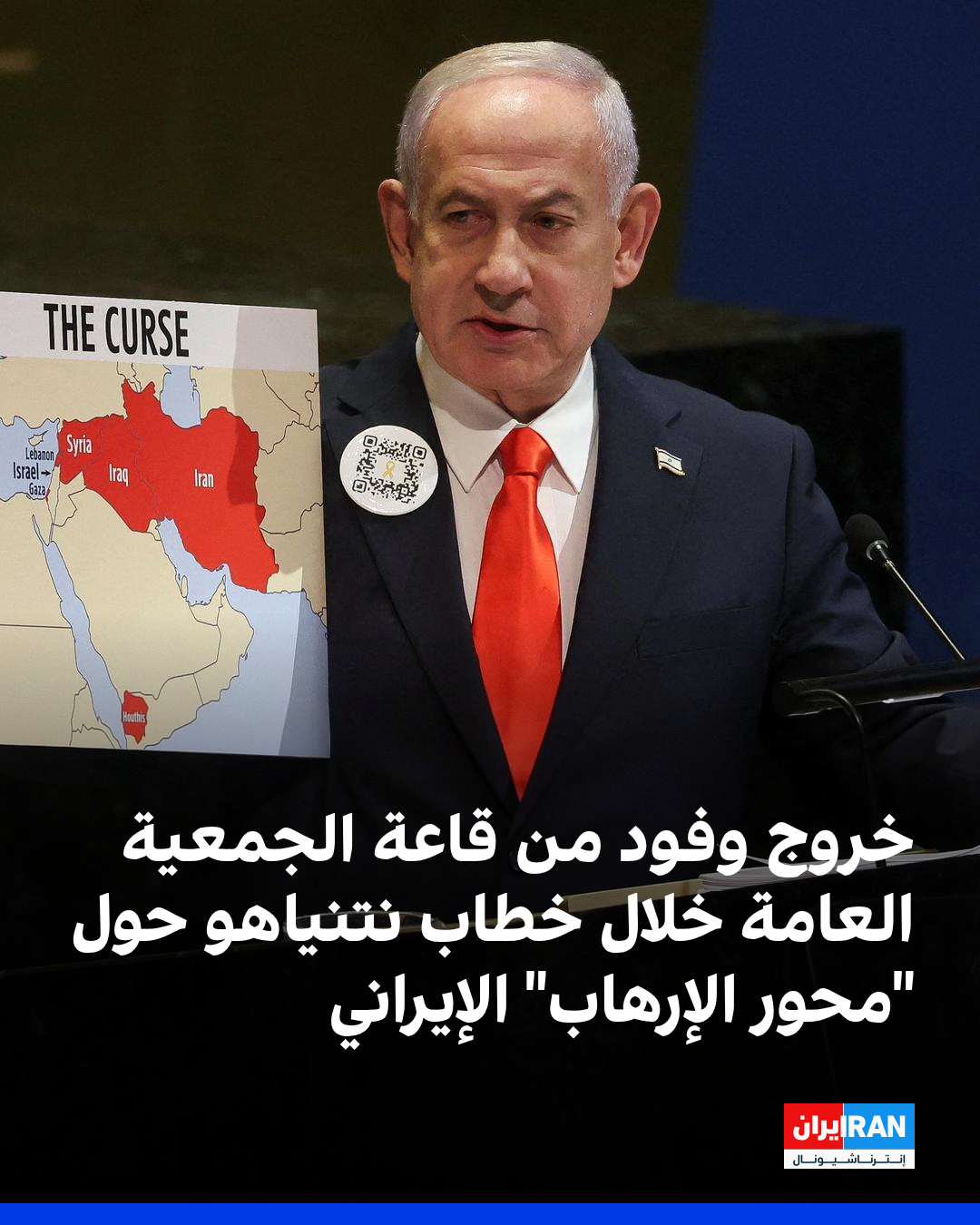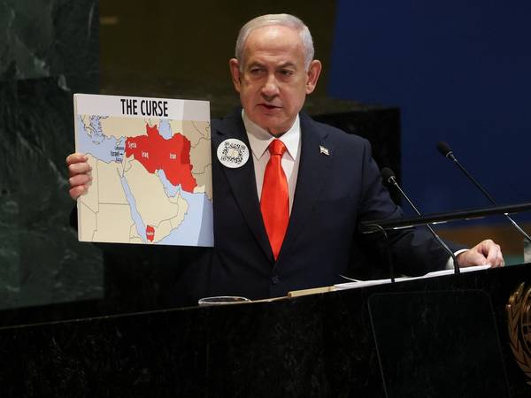 وقال نتنياهو إنّه "العام الماضي وقفت هنا وأظهرت هذه الخريطة. هذه الخريطة تُظهر لعنة محور الإرهاب الإيراني. هذا المحور هدد سلامة العالم بأسره وهدّد استقرار منطقتنا وحتى وجود دولتي إسرائيل".