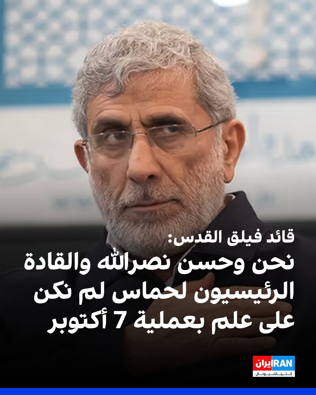 وأكد قاآني: "نحن وحسن نصر الله والقادة الرئيسيون لحماس لم نكن على علم بعملية 7 أكتوبر".