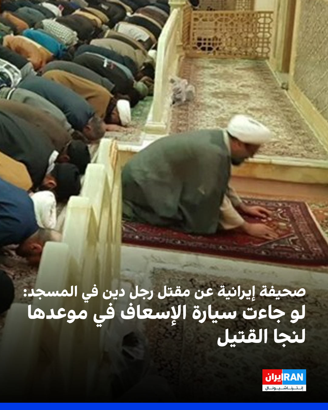 ذكرت صحيفة "جوان" التابعة للحرس الثوري الإيراني، في تقرير عن مقتل ولي الله حيدري، إمام المسجد الذي قُتل طعناً داخل مسجد في منطقة باغ فيض بطهران، نقلاً عن سكان الحي أن تأخر وصول سيارة الإسعاف كان سبباً في عدم نجاته.