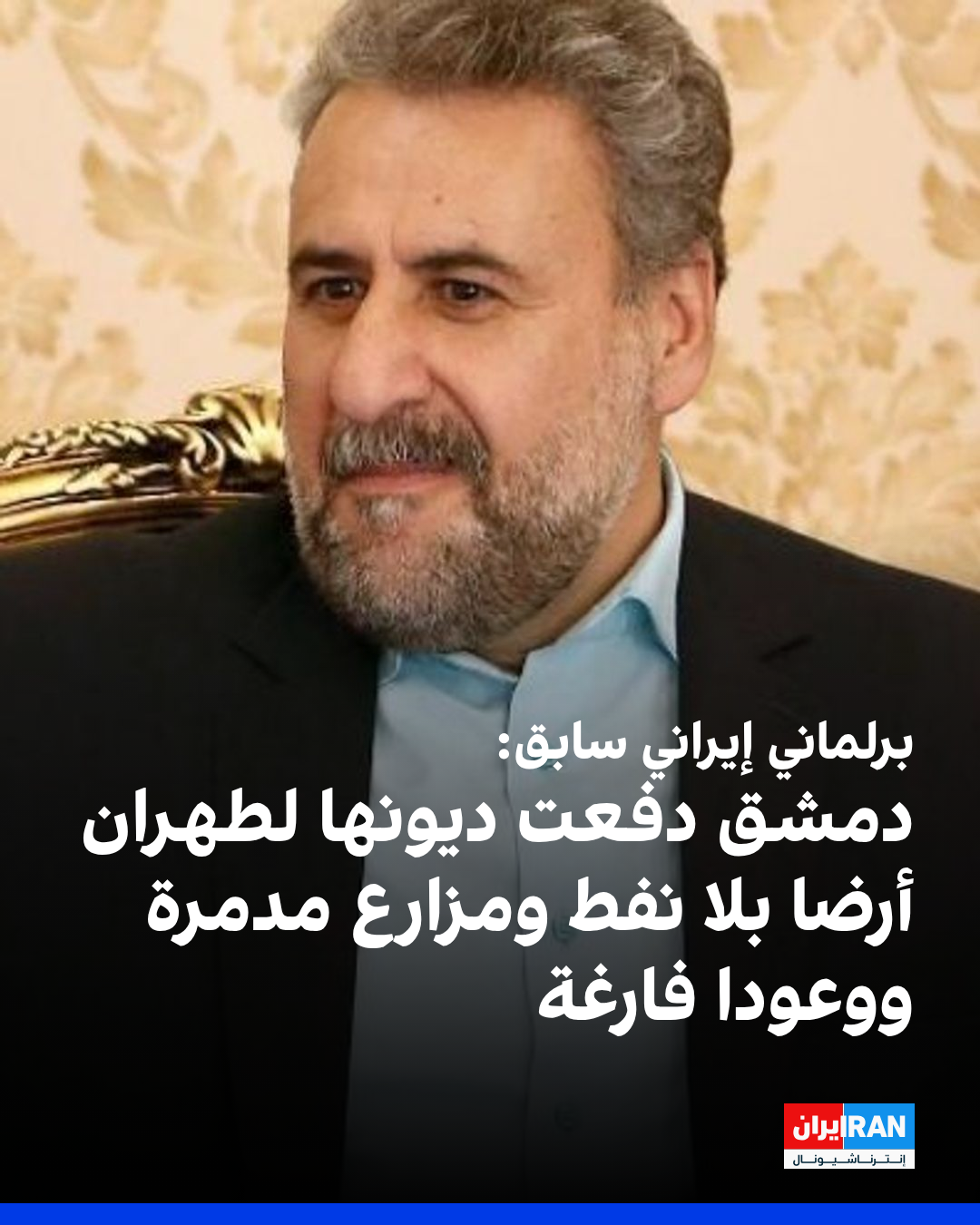 كشف الرئيس السابق للجنة الأمن القومي في البرلمان الإيراني، حشمت الله فلاحت بيشه، أن سوريا قدّمت لإيران أراضي خالية من النفط، ومزارع أبقار مدمّرة، ووعوداً بلا ضمانات، كوسيلة لسداد ديونها لطهران.