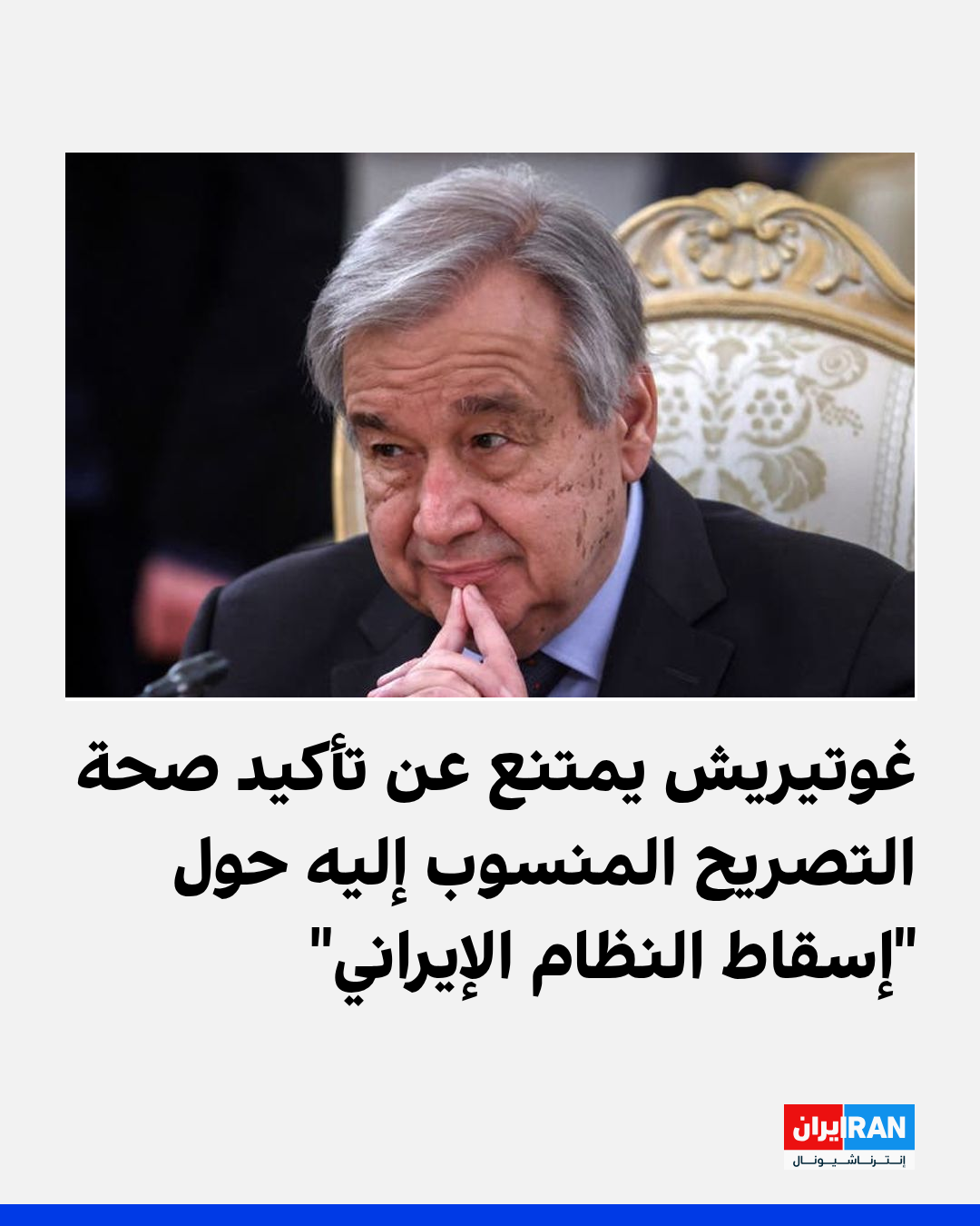 امتنع الأمين العام للأمم المتحدة، أنطونيو غوتيريش، عن تأكيد صحة التصريح المنسوب إليه من قبل محمد رضا عارف، النائب الأول للرئيس الإيراني مسعود بزشكيان، والذي قال فيه إن الأمين العام أبلغه بأن "ملف إسقاط النظام الإيراني أُغلق بعد الحرب التي استمرت 12 يوماً".