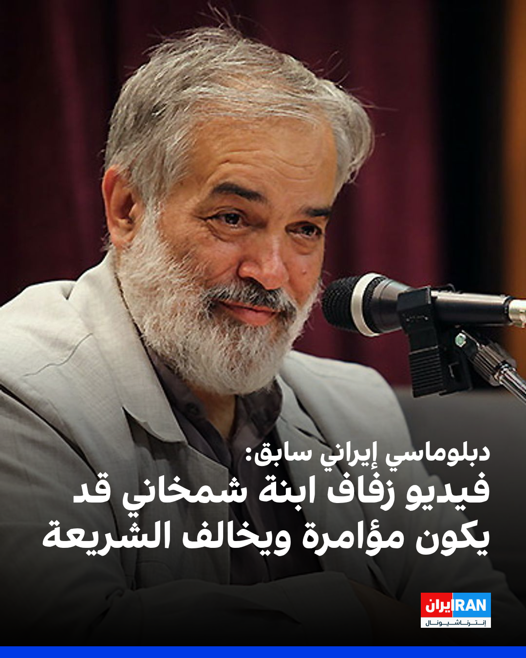 وأضاف: "إذا كان الفيديو حقيقيًا، فإن نظرات شمخاني منخفضة ولا يلتفت للنساء، في حين أن ابنته تظهر بفستان الزفاف مكشوف الصدر، ونشره مخالف للشريعة".