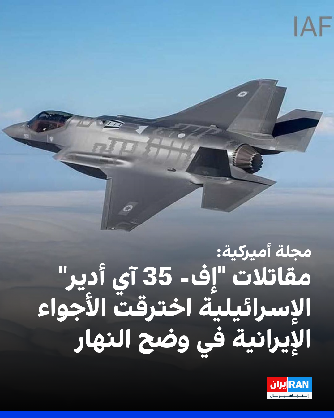 ذكرت مجلة "ناشيونال سيكيوريتي" الأميركية أنّ مقاتلات الشبح "إف 35 آي أدير" الإسرائيلية شاركت في عملية "الأسد الصاعد" ودخلت أجواء إيران، في وضح النهار، واخترقت منظومات دفاعها الجوي، ودمرت منشآت نووية بواسطة قنابل موجهة بدقة، وعادت دون خسائر.
