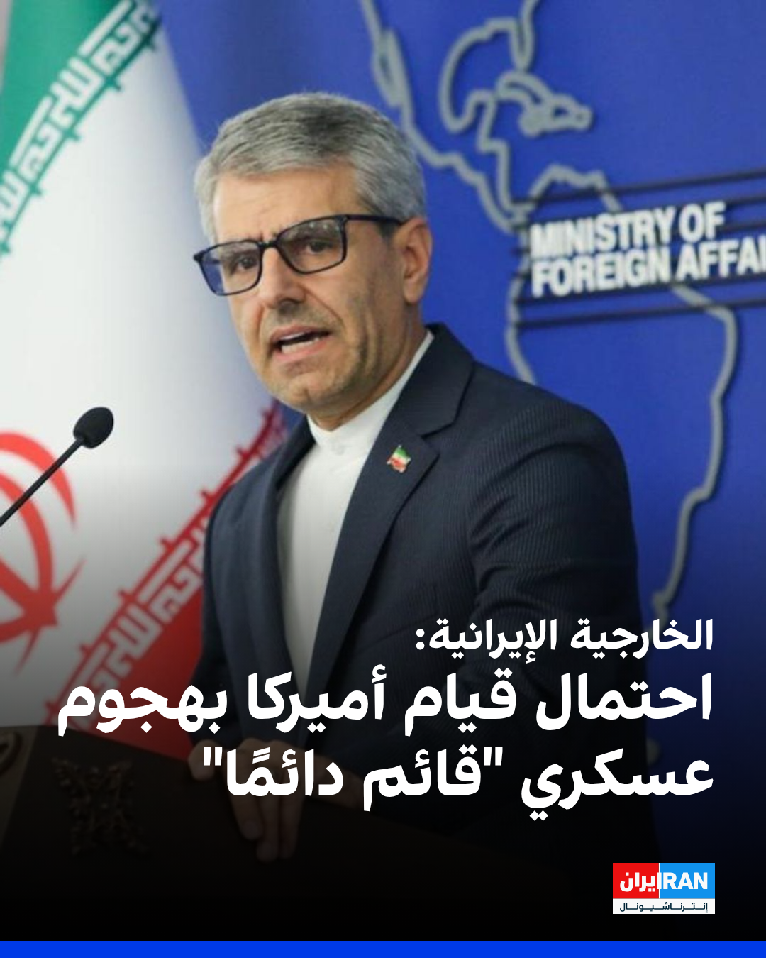 قال المتحدث باسم وزارة الخارجية الإيرانية، إن احتمال تعرض الولايات المتحدة لإيران بعمل عسكري "موجود دائما" ولا يمكن نفيه، مؤكدًا أن طهران تأخذ هذا الاحتمال بعين الاعتبار في سياساتها الدفاعية.