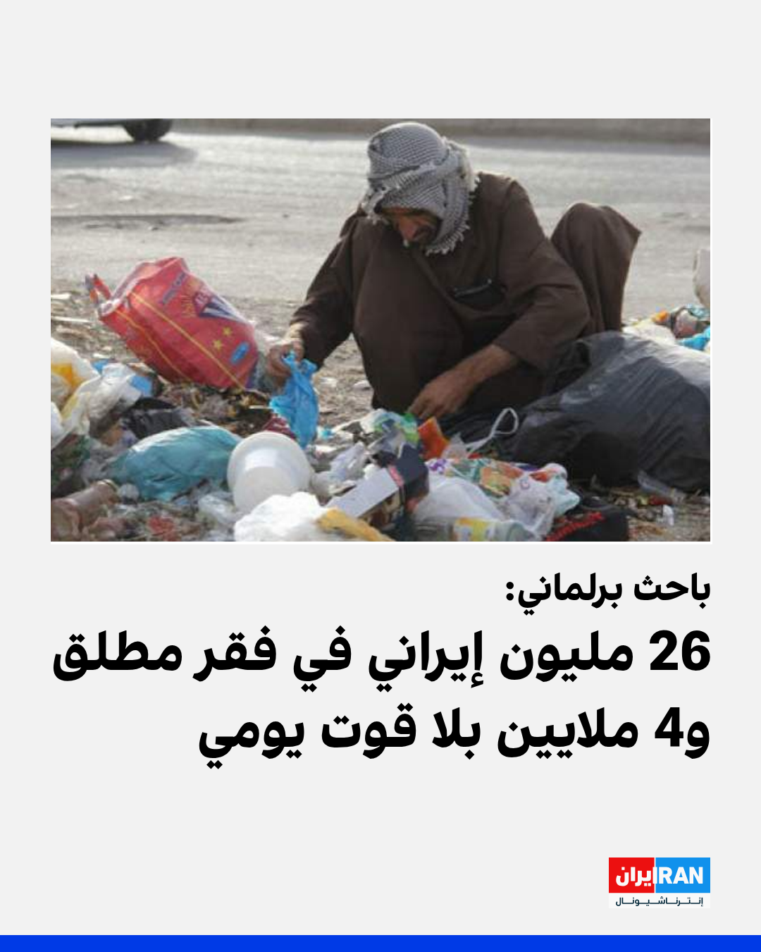 قال عضو الهيئة العلمية في مركز أبحاث البرلمان الإيراني، سيد هادي موسوينيك، إن نحو 26 مليون شخص في إيران يعانون من الفقر المطلق، وهو رقم يفوق المعدلات العالمية.