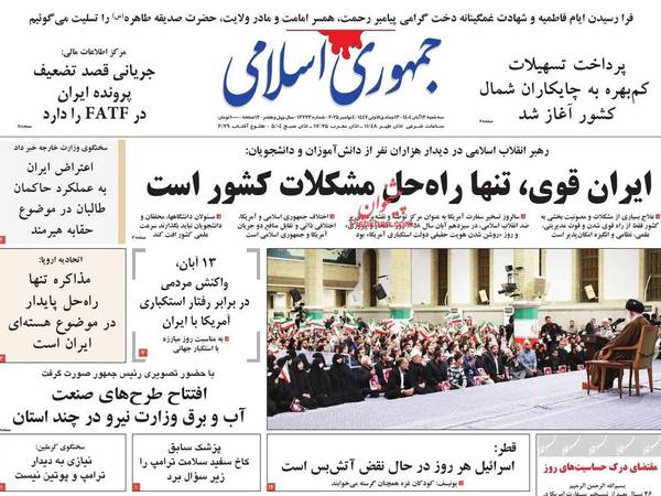 اهتمت الصحف الإيرانية الصادرة اليوم الثلاثاء 4 نوفمبر (تشرين الثاني) بتصريحات المرشد الإيراني علي خامنئي حول الخلاف الجوهرى مع الولايات المتحدة، والمواقف من ذكرى احتلال السفارة الأميركية في طهران.