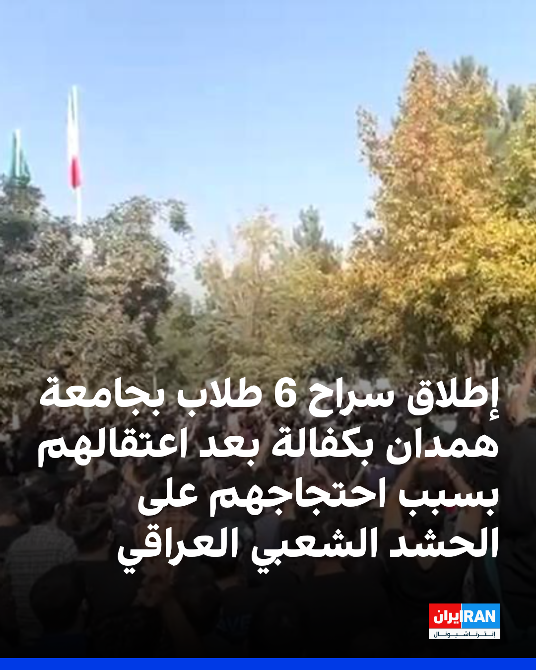 ذكرت مصادر أنه تم إطلاق سراح 6 طلاب معتقلين من جامعة بوعلي سينا في مدينة همدان، شمال غرب إيران، بكفالة مالية، كانوا قد اعتُقلوا في 11 أكتوبر الماضي، خلال تجمع احتجاجي ضد وجود عناصر من ميليشيا "الحشد الشعبي" العراقية في الجامعة، بعد شهر من احتجازهم في سجن الوند بالمدينة.