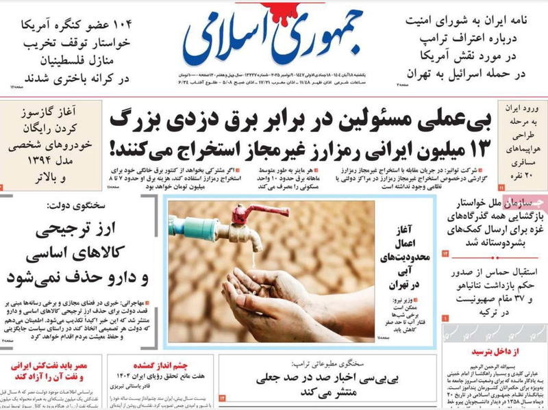 سلطت صحيفة "جوان"، التابعة للحرس الثوري الإيراني، الضوء على أخطر موجة جفاف تشهدها إيران منذ ستين عامًا، وهاجمت بشدة ما وصفته بـ "الإدارة العطشى"، التي تتعامل مع أزمة المياه بـ "عقلية ترقيعية" بدلاً من التخطيط الطويل الأمد.
