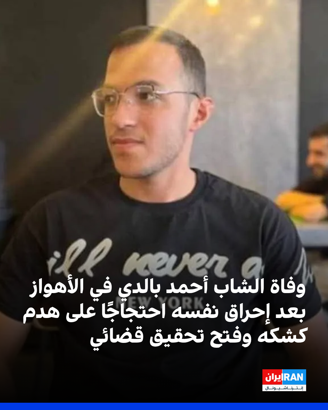 توفي أحمد بالدي، الشاب البالغ من العمر 20 عامًا في الأهواز، بعد أن أقدم على إحراق نفسه احتجاجًا على هدم كشكه من قبل بلدية المدينة. وكان بالدي قد نُقل إلى المستشفى إثر حروق بلغت 70% من جسده، لكنه لم ينجُ.