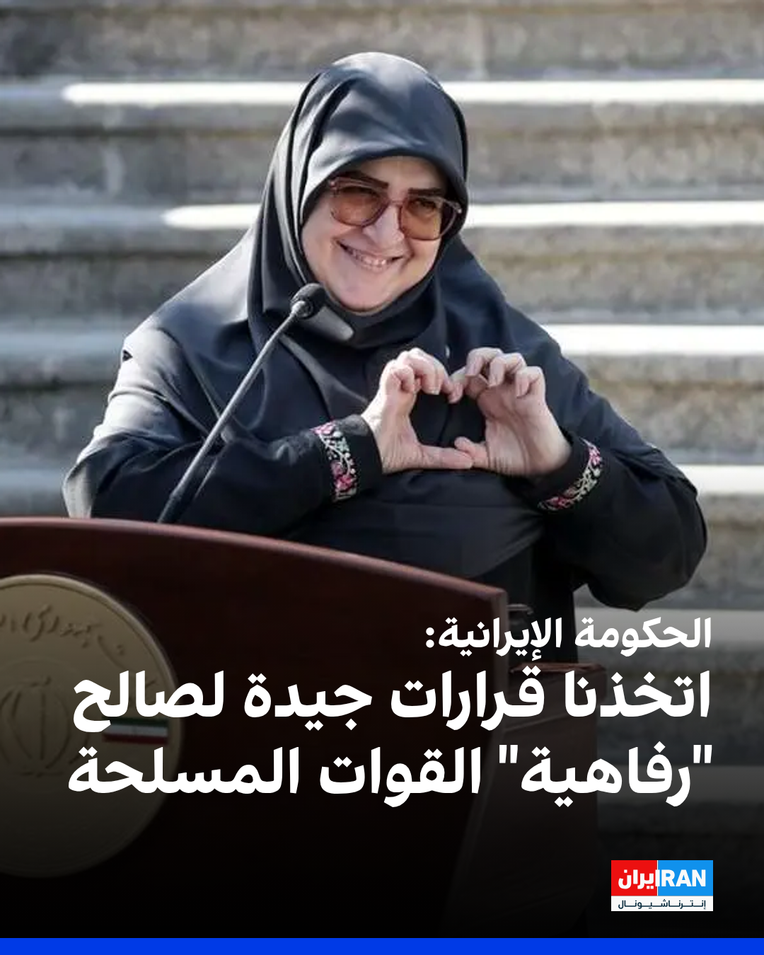 قالت المتحدثة باسم الحكومة الإيرانية، فاطمة مهاجراني، إن "قرارات جيدة" تم اتخاذها في مجال رفاهية قوات الجيش الإيراني. وأضافت: "على سبيل المثال، تم اتخاذ قرارات جيدة بشأن الإسكان والعلاج والرعاية الاجتماعية".