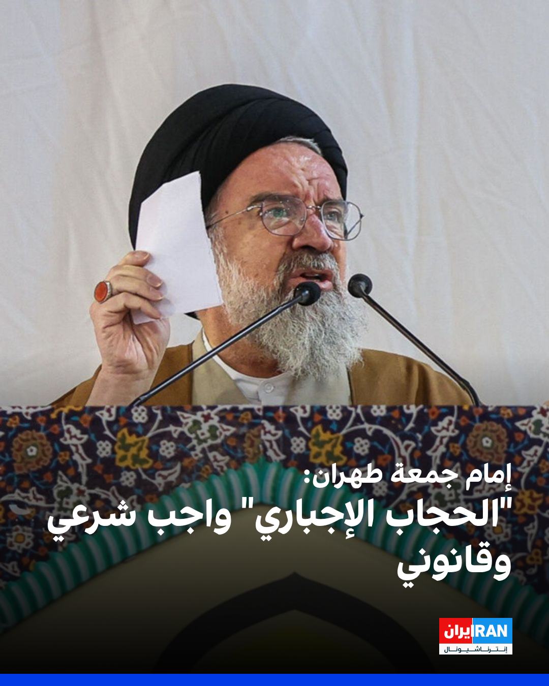 وأضاف أن "مسألة الحجاب الإجباري واجبة شرعًا وقانونًا. هناك فئتان من غير المحجبات: فئة معارضة يتعامل القانون معها، وفئة أخرى من الشيعة المهتمين التي يجب أن تكون ضمن صفوف السيدة فاطمة الزهراء. وأنصح جميع السيدات بأن يضعن دينهن ووطنهن نصب أعينهن".