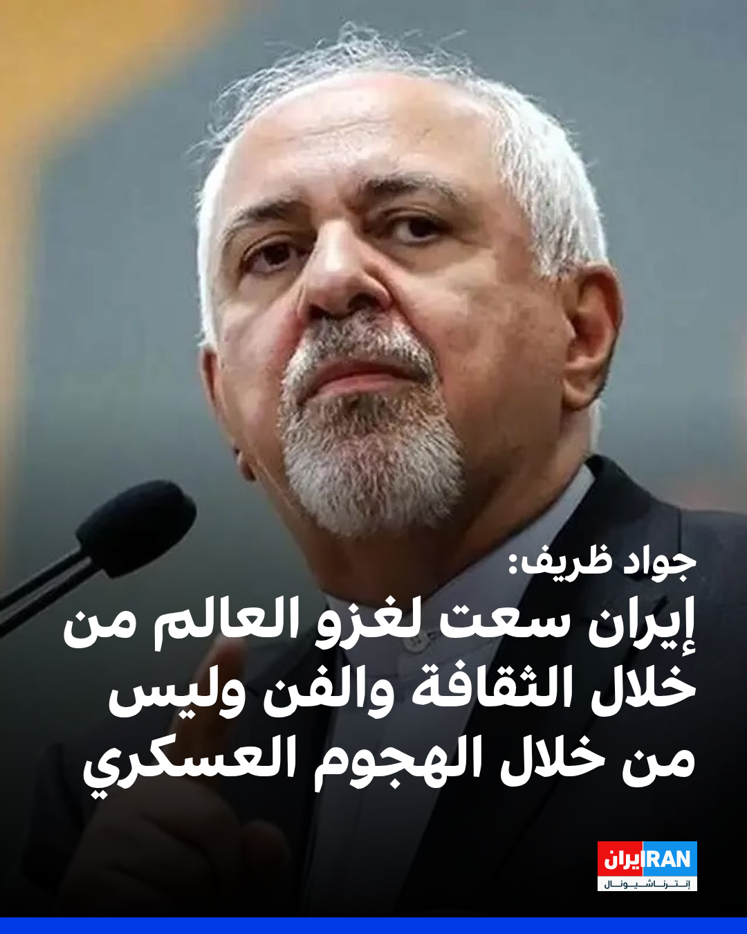 قال محمد جواد ظريف، وزير الخارجية الإيرانية الأسبق، إن إيران لم تسع في أي وقت إلى غزو العالم عبر الهجوم العسكري، بل سعت إلى ذلك عبر الثقافة والفن، مضيفاً أن هذا الهدف "اكتسب بعد الثورة الإسلامية" زخماً جديداً.