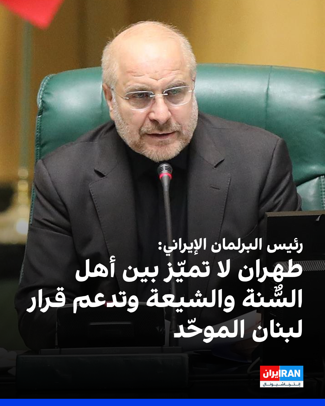 قال رئيس البرلمان الإيراني، محمد باقر قاليباف، خلال لقائه نائب رئيس مجلس النواب اللبناني للشؤون السياسية في طهران: "إن إيران لا تميّز بين أهل السُّنة والشيعة، وتعتبر أعداء العالم الإسلامي أعداء لها".