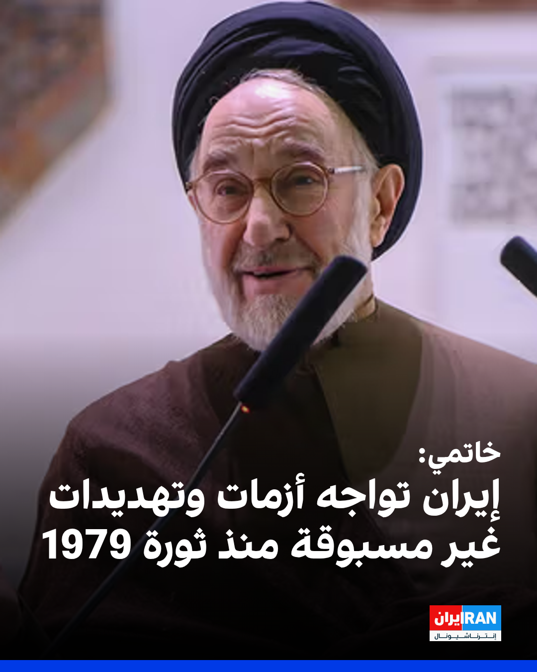 وأضاف خاتمي: "خلال السنوات التي أعقبت ثورة 1979 وحتى اليوم، لم تشهد إيران أزمة مماثلة للتحديات الحالية والتهديدات القائمة".