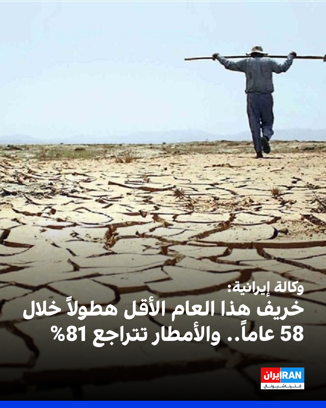 ذكرت وكالة "إيسنا" أن خريف هذا العام يُعدّ الأقل هطولاً للأمطار خلال الـ58 سنة الماضية، حيث تراجعت كمية الأمطار بنسبة 81% مقارنة بالمعدل المناخي طويل الأمد.