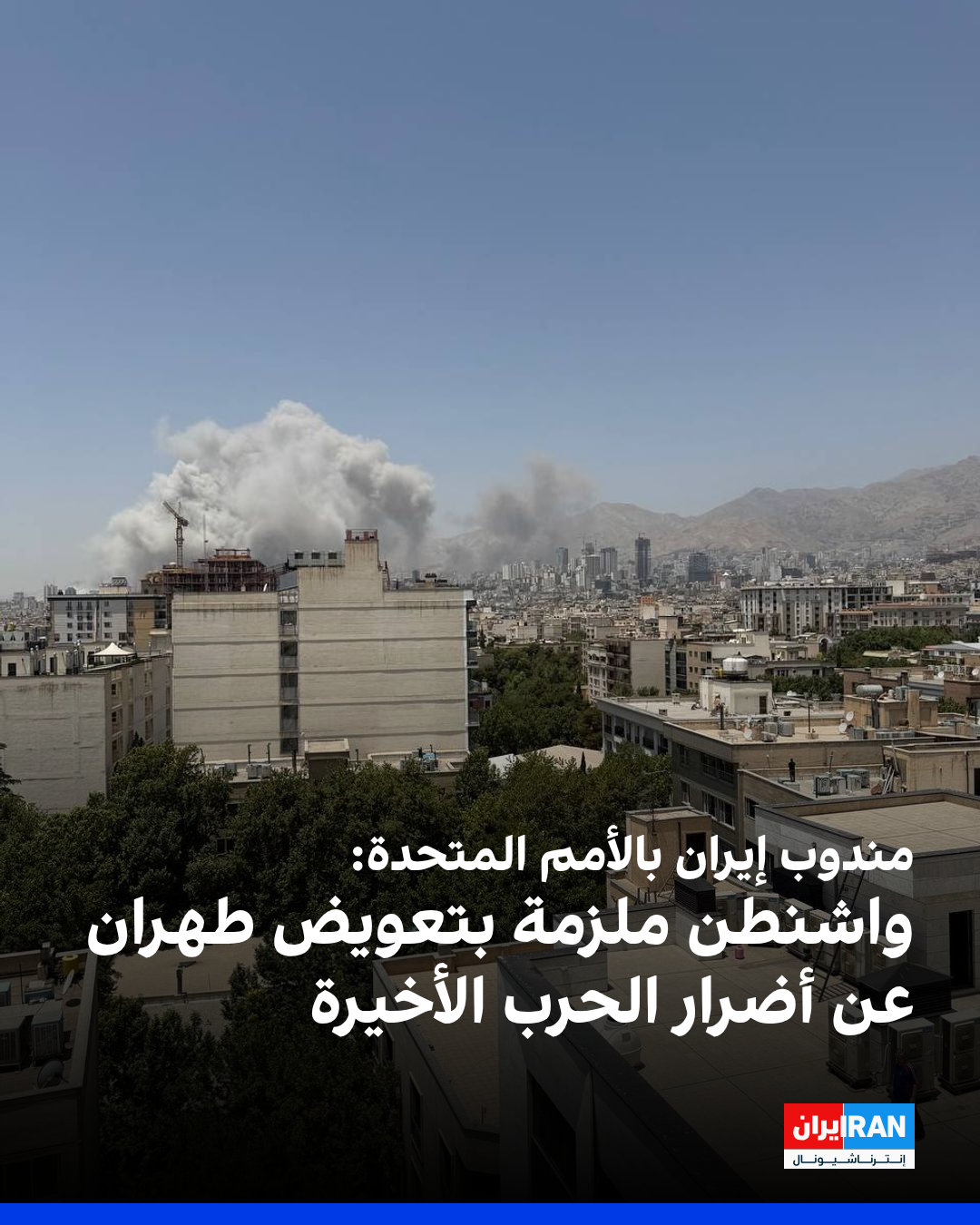 قال ممثل إيران في الأمم المتحدة، أمير سعيد إيرواني، في رسالة موجّهة إلى الأمين العام للمنظمة ورئيس مجلس الأمن: "إن واشنطن مُلزَمة بتعويض كامل عن الأضرار المادية والمعنوية، التي لحقت بطهران؛ نتيجة الهجمات العسكرية، خلال حرب الـ 12 يومًا".