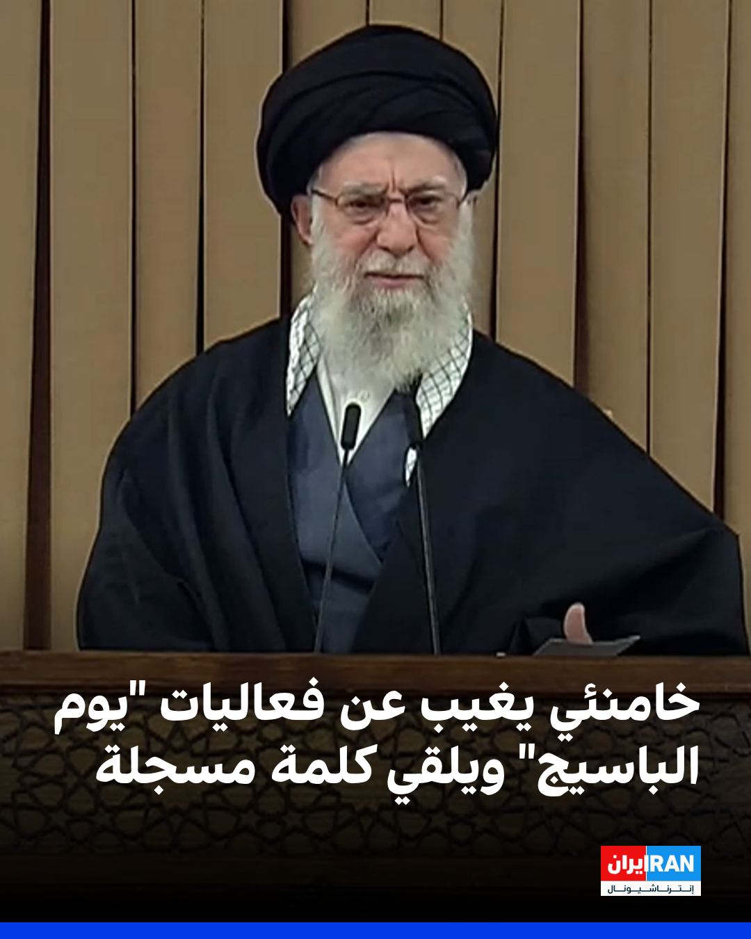 ألقى المرشد علي خامنئي، كلمة مسجلة، بمناسبة "يوم الباسيج"، في التقويم الإيراني مشيرًا إلى أنه لم يتمكن من إلقاء كلماته مباشرة أمام قوات 'الباسيج".