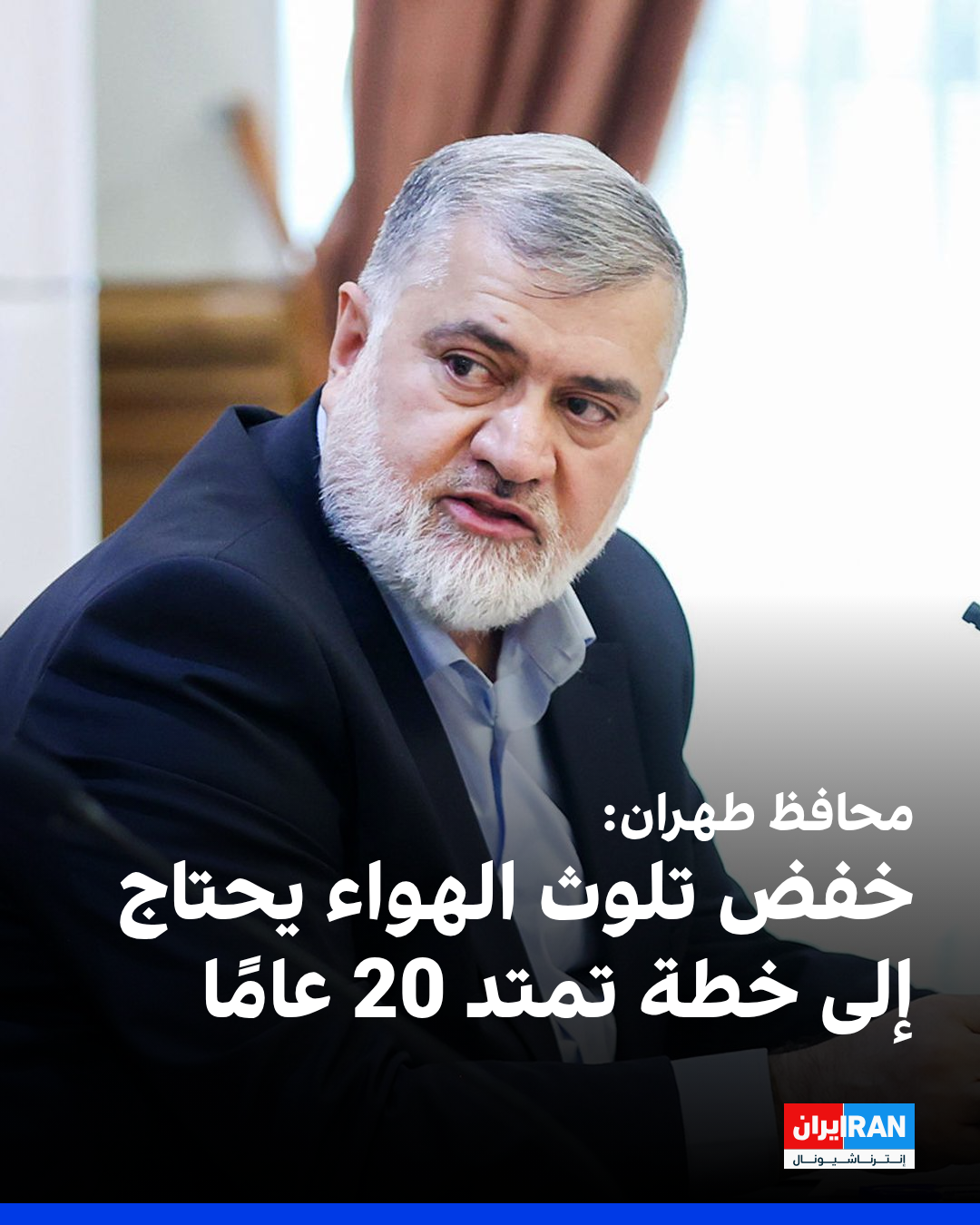 قال محافظ طهران، محمد صادق معتمديان: "لتقليل تلوث الهواء، يجب وضع خطة تمتد لعشرين عامًا، ويتطلب تحقيق ذلك إرادة وطنية وإجراءات عملية تشمل تطوير مصادر الطاقة المتجددة واستبدال المركبات القديمة".
