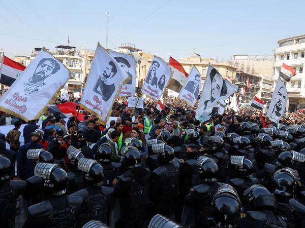 “Stop the neighbors stealing our dollars,” one banner read, alluding to Iran.