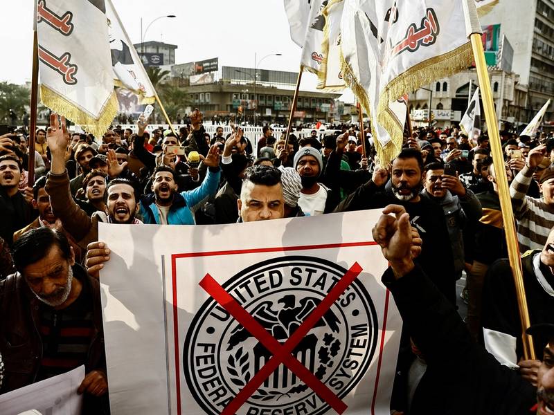 Hundreds of people demonstrated near the central bank headquarters in Baghdad to protest the devaluation of the Iraqi dinar against the dollar, which has triggered a rise in prices of imported consumer goods.