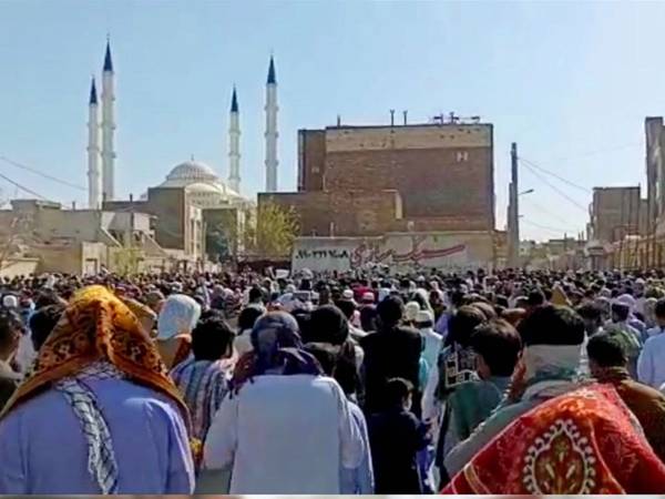 "We swear on our comrades' blood to stand strong until the end," hundreds of demonstrators were seen chanting in a video from the flashpoint city. Another widely-circulated video showed security forces beating and arresting a Baluch man trying to enter the Makki Mosque.