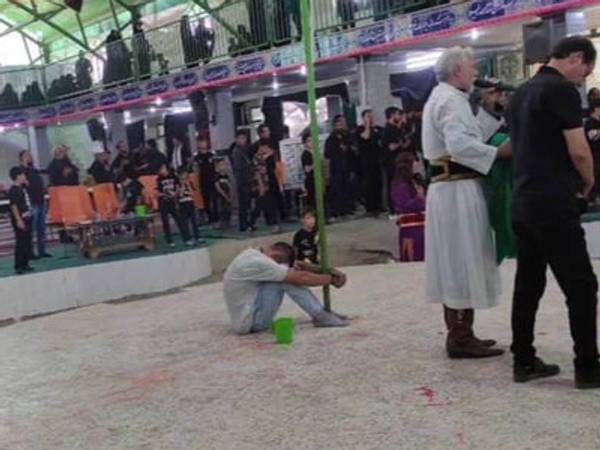 A picture of Lojei with his hands and feet tied to a post with a bottle of water near him, which the thirsty young man could not reach, has turned into one of the icons of the protest movement. The performance alluded to the Shia belief that the Imam’s adversary, Yazid, cut his troops’ access to the waters of Euphrates and killed them after days of thirst in the parched desert.
