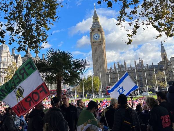 In London, for instance, a group of Iranians joined the rally in support of Israel, waving flags of pre-Revolutionary Iran. One Iranian activist took to the stage to offer her perspective to the crowd.