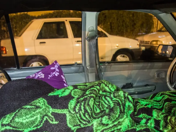 “This is where I sleep most nights,” Reza says, motioning to his car. The terminal feels slightly safer than parking on random streets, but it’s far from secure. He pulls a thin blanket from the back seat and tucks a worn pillow into the corner. Before settling in, Reza locks his doors carefully, constantly on alert for theft or assault.