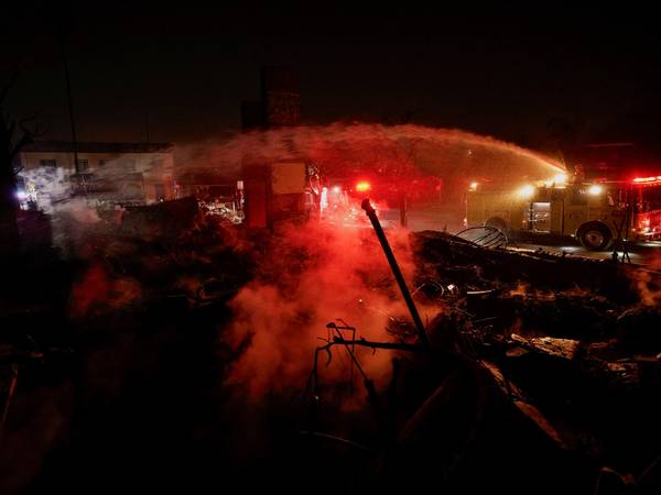 Since Tuesday, six simultaneous blazes have swept through Los Angeles County neighborhoods, claiming at least 11 lives and damaging or destroying 10,000 structures. The toll is expected to rise as firefighters conduct house-to-house searches.