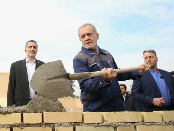Later in the day, Pezeshkian and one of his vice presidents posed for photos dressed as construction workers while laying bricks for the construction of a school in Khuzestan.