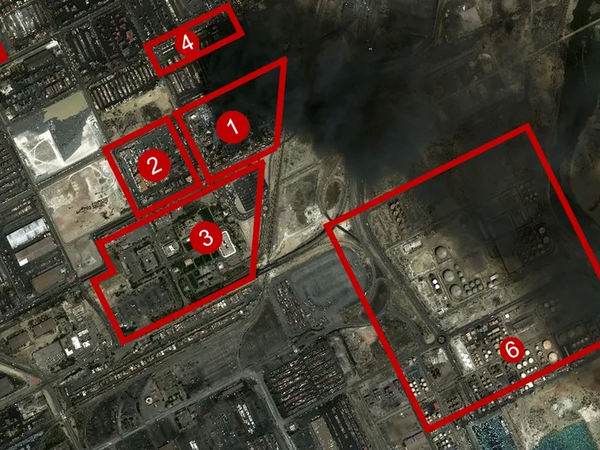 The satellite images reveal that the Sina yard, the blast's epicenter which could hold between 12,000 and 20,000 twenty-foot containers, has been completely destroyed.