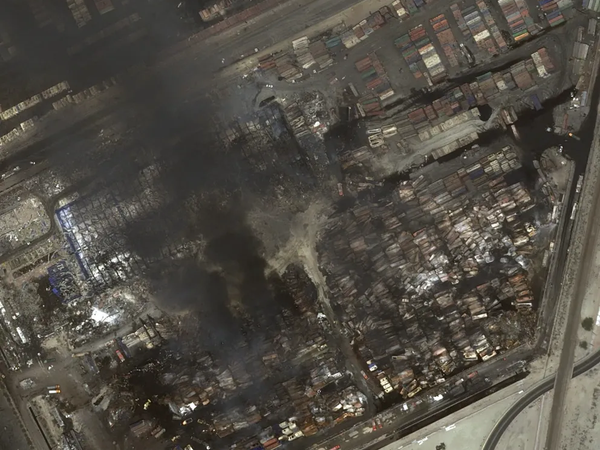 The images also show a large number of shipping containers crushed on both sides of the explosion site, highlighting the extent of the destruction.